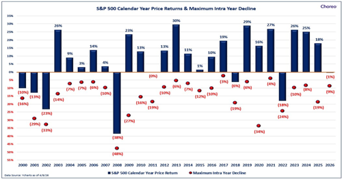 Volatility is not a detour from investing—it’s part of the journey. Geopolitical events and inflation scares can create short-term dislocation, but markets have historically adjusted over time. The objective is less about predicting what happens next and more about staying diversified and aligned to a long-term plan through changing conditions. The objective is to keep risk aligned with goals, so short-term volatility does not force long-term decisions. As always, we encourage you to reach out to your Choreo advisor with additional questions.