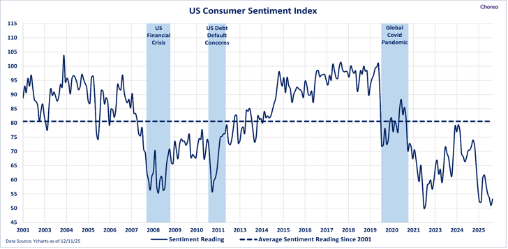 4. Consumer strength: Consumer spending in the U.S. is the predominant economic force.  This spending has remained strong in a wide variety of periods (including during the COVID pandemic-led recession). Signs of weakness for consumers have emerged, albeit inconsistently across demographic segments, with lower-income households beginning to feel inflationary pressures while higher-income households have generally shown continued strength. Consumer sentiment has been reflective of these challenges and remains depressed as shown in the chart below. Change for the consumer and their spending habits could have profound implications for the broader economy, making it a high priority item to watch in 2026.