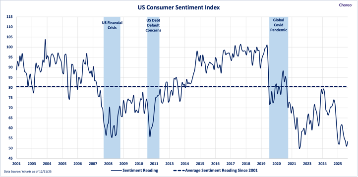 4. Consumer strength: Consumer spending in the U.S. is the predominant economic force. This spending has remained strong in a wide variety of periods (including during the COVID pandemic-led recession). Signs of weakness for consumers have emerged, albeit inconsistently across demographic segments, with lower-income households beginning to feel inflationary pressures while higher-income households have generally shown continued strength. Consumer sentiment has been reflective of these challenges and remains depressed as shown in the chart below. Change for the consumer and their spending habits could have profound implications for the broader economy, making it a high priority item to watch in 2026.