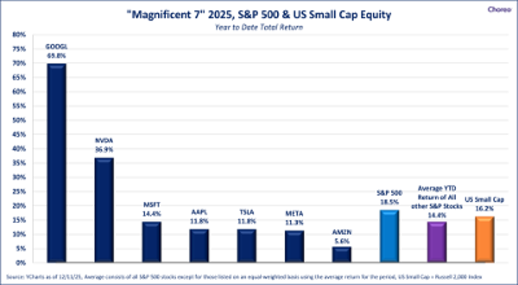 The Choreo team is hyper-focused on long-term investment management to closely align investor goals and objectives. The market environment will change over time, whether good or bad. Taking a diversified approach is a tool used to optimize outcomes. As 2025 comes to a close and 2026 begins, we take a moment to recognize the most important asset class in our lives: our friends, our families, and of course our clients. We wish you and your family a happy and healthy new year and we look forward to a fruitful 2026! As always, please reach out with any questions or comments.