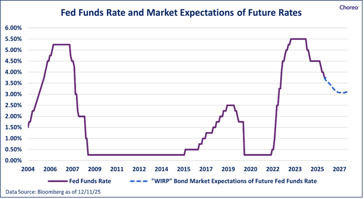 1. Interest rates: Interest rates are a mundane but essential topic that global markets focus on acutely, particularly in times of uncertainty. Lower rates generally mean less expensive capital for companies to fund projects and hire employees, and for individuals financing purchases (i.e., houses, cars, etc.). Current expectations are shown in the graph below, with the market expecting the Federal Reserve (the “Fed”) to cut rates by 0.25% - 0.50% to settle in the low 3% range in 2026. In general, the Fed only has a degree of control over short-term interest rates, whereas longer term rates are often influenced by a host of separate factors. In truth, however, even short-term interest rates are subject to market forces, dictated by how investors expect the future to unfold. Regardless, the direction of interest rates is a critical input to watch in 2026.