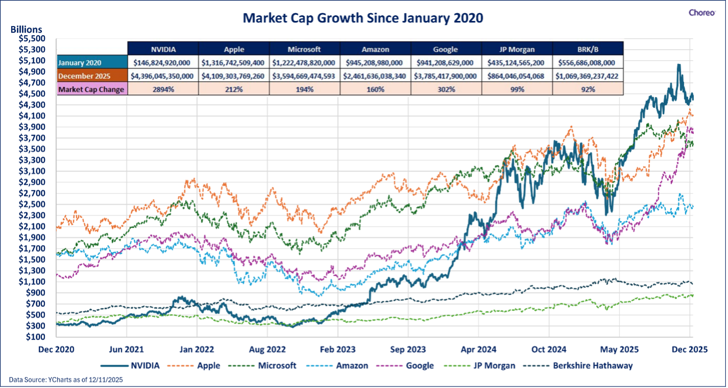 3. Nvidia (and the other 6): In January of 2020 amidst the COVID pandemic, Nvidia had a market capitalization of $150 billion. Very few outside of the technology or investment landscape had even heard of the company. Today, companies valued around $150 billion include Capital One, Boeing, Pfizer and Adobe, generally considered household names.  As of December 9, 2025, Nvidia has a market capitalization of $4.5 trillion and is the largest publicly listed company in the world. It has led a group of large companies affectionately known as the Magnificent 7 (“mag 7”), including Alphabet (the parent company of Google), Apple, Microsoft, Meta (the parent company of Facebook and Instagram), and Tesla.  Nvidia didn’t exactly come out of nowhere, but its semiconductor chips have now become essential to the ongoing AI boom.   As of the end of November, these companies represent roughly 35% of the S&P 500. Naturally, how they perform can impact broader market returns. Nvidia alone accounts for just under 8% of the index. In other words, if these companies continue to grow and do well, markets could react favorably, and vice versa. Their size alone (in excess of $1 trillion, which was believed to be an almost unattainable benchmark not too long ago) makes them worth attention in 2026.