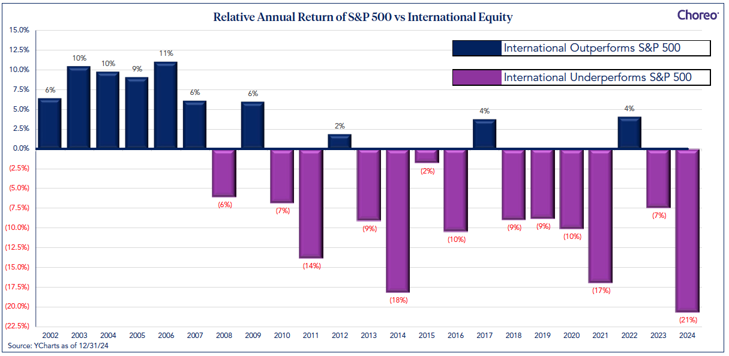 Furthering on the dominance of the mega-cap stocks, starting with the S&P 500, 2023 and 2024 saw the largest outperformance of the market cap weightings vs. equal weight in more than two decades. This occurred two years in a row, and the degree of outperformance is staggering as shown in the graph below. This further emphasizes the importance of the fact that the international markets simply did not have these companies.