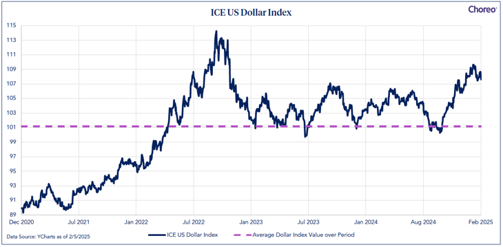 Similarly, the U.S. dollar has also performed strongly (more on this in a moment). When the impact of currency, and the impact of a handful of stocks is neutralized, the international markets have performed in line with the U.S. The graph below shows the returns since the beginning of 2024 through January 23, 2025. The S&P 500 was up 30.0%, dominated by the largest companies in the world (Nvidia, Microsoft, Apple, etc.). The S&P 500 index performance is based on market capitalization. In other words, the larger the company, the more impact their performance has on the index. When using an equal-weighted version of the S&P 500, where all companies are weighted the same, thereby eliminating the outsized impact of the mega-caps, performance drops to 17.4%: same universe, simply different weightings.