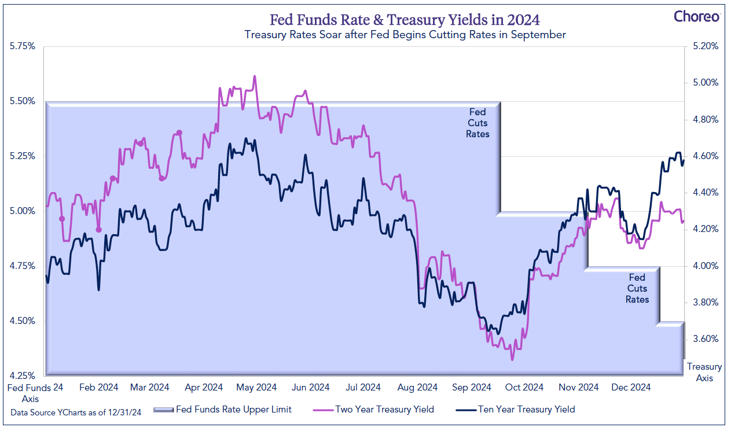The bond markets experienced another volatile year with the 10-year Treasury Note trading between 3.63% and 4.70% yields, a dramatic move considering the Federal Reserve (the “Fed”) cut interest rates 3 times for a total of 100 basis points.