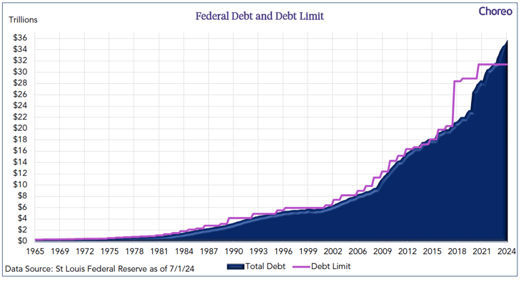 We saw this in December with yet another debate on funding the government and the debt ceiling discussion coming to the forefront. Very few would argue that our nation, and in fact many nations around the globe, have spent too much of the first half of the decade relying on debt fueled growth. This was a lot easier to swallow when interest rates were close to zero percent. As rates have risen, and economic growth ensued, governments have kept spending and deficits have mostly grown, along with the growing national debt and the cost associated with servicing that debt. The total debt is shown along with the debt ceiling during those times in the graph below.