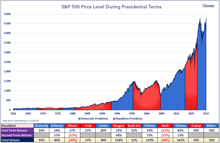 The data also suffers from small sample sizes, making it difficult to draw conclusions. While presidential elections can stoke concerns for investors, history shows there is no consistent relationship between which party is in office and stock returns. Rather, stocks have trended higher regardless of whether a Democrat or Republican was in the White House, an ode to the nation’s unique ability to adapt. Over the long run, the market has continued to grow, demonstrating the market's trajectory is influenced more-so by broader economic forces than by the political party in power. The following chart and corresponding table below highlight this.