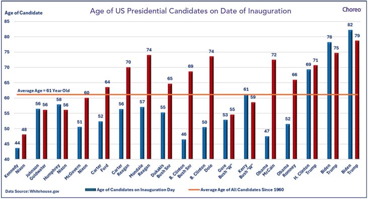 In many ways, nothing is unique about this election and in some ways everything is unique. Throughout history, political pundits utter the common phrase every four years: “this is the most important election in history.” Of course that is an exaggeration, but each election cycle certainly feels that way. The 2024 presidential election will be unique in that at the onset it began with a current and a former President facing one another, which may seem unprecedented. However, this occurred twice previously, the last being in the 1896 election between Grover Cleveland and William McKinley. The more obvious, truly unique angle is that the two major political parties were set to nominate the oldest candidates in U.S. history, President Joe Biden (81 years old) and former President Donald Trump (78 years old). For comparison's sake, the average age of nominees since the Kennedy Administration was 61 years old.