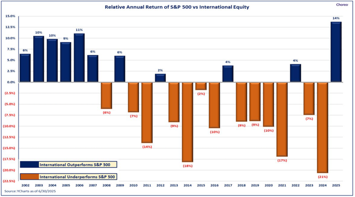 International markets have performed very well in 2025 (even during the challenging month of April) and continue to provide portfolio strength. Of course, we don’t know yet how assets will perform, which is why it’s essential to have a diversified portfolio ahead of actually “needing one.” The chart below highlights the outperformance of international markets in 2025 vs. the S&P 500. It’s been some time since we’ve seen sustained outperformance, but 2025 serves as a reminder of why diversification generally works for long-term investors.