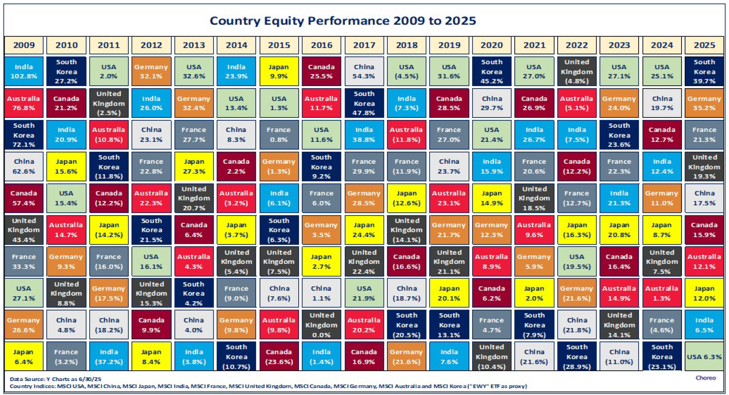 The chart below shows the equity market performance for the 1st half of 2025 for major markets and equity asset classes, as well as the quarterly performance. This data illustrates the value of diversification.