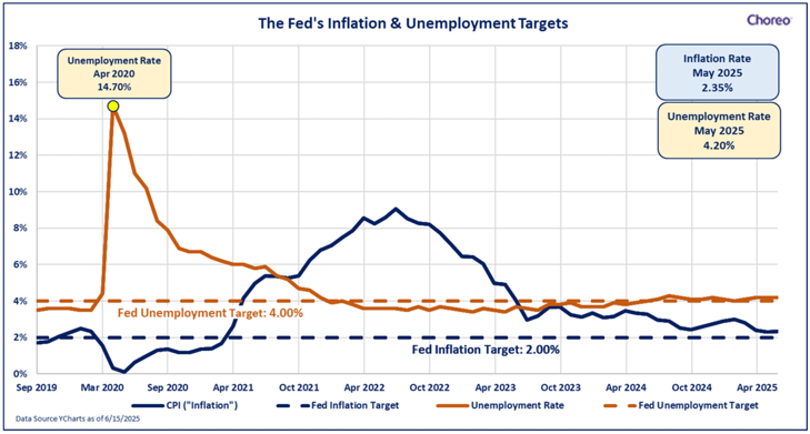 The Fed remains a quiet driver of market activity as well. Opinions vary as to whether the Fed is driving markets or vice versa, and in early July Fed Chair Jerome Powell said, “In effect, we went on hold when we saw the size of the tariffs*.” The Fed serves a dual mandate, focusing on full employment as well as stable prices. Labor markets remain strong enough (although they may be weakening in real time) but the inflation picture remains murky as supply chain disruptions and tariffs could derail progress toward the stable prices mandate, as shown in the graph below:
