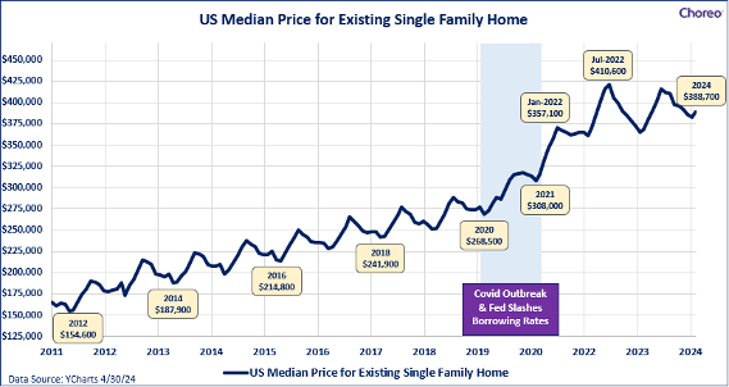 Historically, interest rates and asset prices have been inversely related (i.e., when rates rise, prices fall). When the Fed started hiking rates to combat inflation, there was a widespread expectation amongst market participants that home prices would fall, along with other interest rate sensitive assets. Surprisingly, the opposite happened – home prices surged. The average selling price of single-family homes rose from $308K in early 2021 to $389K today, a 26% increase (as shown in the first graph above), and up from $268K pre-covid.