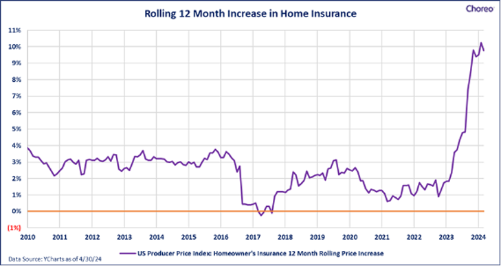 Not only are the first order impacts meaningful, but the derivate impacts are notable as well. For example, as home prices rose, the cost of insuring the home has risen. In fact, coupled with materials costs, labor and other factors, insurers have raised prices on home insurance at the fastest pace in at least a decade as shown in the graph below.