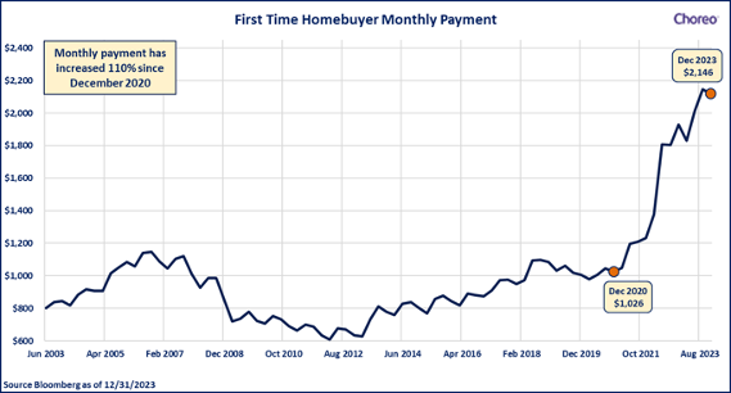 Additional challenges relating to the costs of home ownership are significant; particularly for first time buyers, who have seen costs roughly double since 2020 as rising interest rates coupled with home prices increasing have created difficulties with affordability. Currently the monthly payment for a first-time homebuyer sits at over $2,100 vs. $1,026 in December 2020.