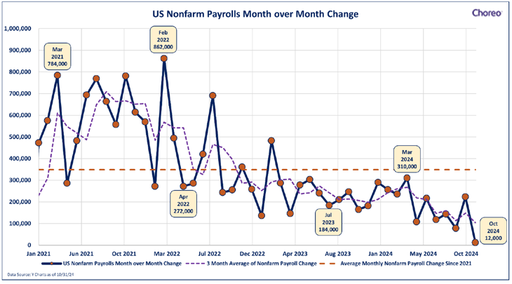 Recent labor market reports including job openings and broad reports all seem to point towards a meaningful slowdown in jobs growth. However, much of this data may be somewhat of a red herring as they were impacted by the port strikes, and weather-related issues. Analysis of the labor market should be based on trends over time, rather than small data samples. The longer-term graph of claims data does show some weakening, but more information is needed to detect a meaningful trend. The first glance analysis of a weakening trend in jobs data can shift quickly and a high degree of uncertainty remains.