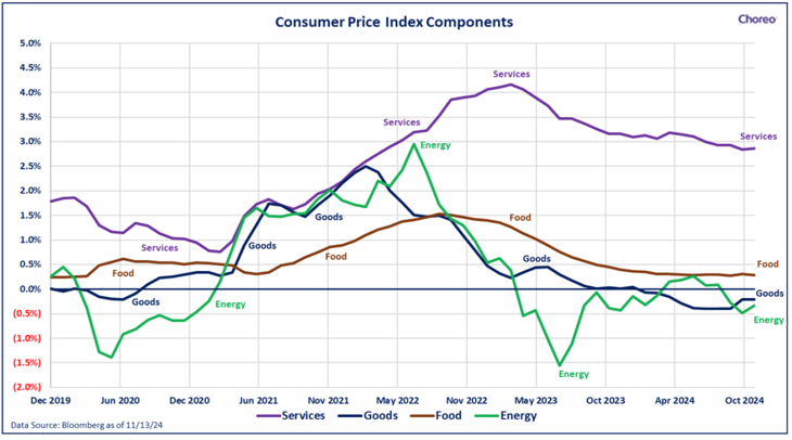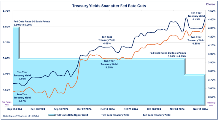 On September 18, the Fed cut rates by 50 basis points for the first time in years, and thus began the interest rate cut cycle. Market expectations for future cuts ramped, and accordingly bond yields sank. During the following meeting on November 7, the Fed cut rates a further 25 bps. How has the bond market reacted? Rates have soared (and correspondingly prices have fallen). The graph below shows the Fed actions year to date versus the bond market’s actual movement as represented by the 10-year U.S. Treasury note. The reasons for this apparent mismatch are complex, but a combination of strong economic data (primarily labor market resilience and inflation normalization slowing) and Presidential election spending concerns have caused bond traders to question the future path of the Fed cuts. Regardless of the exact path, economic data yet to occur will likely determine the forward guidance. This is a classic case of things not always as they appear at first glance. Markets are highly complex with millions of data points feeding into outcomes that are not easy to gauge.