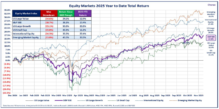 In a year that began with heightened uncertainty, 2025 has delivered a wealth of reasons for investors to feel real gratitude. From strong market performance and monetary policy easing to sector innovation and solid economic fundamentals, the investment landscape continues to reward patience, adaptability, and strategic, long-term thinking. At Choreo, we are most grateful to our clients, professional partners, friends, and families. We feel an enormous sense of gratitude and humility for your trust and confidence as we help you navigate this ever-changing investment landscape in pursuit of your financial goals. We wish you and yours a joyful and prosperous Thanksgiving, and as always, please reach out to us with any questions or comments.