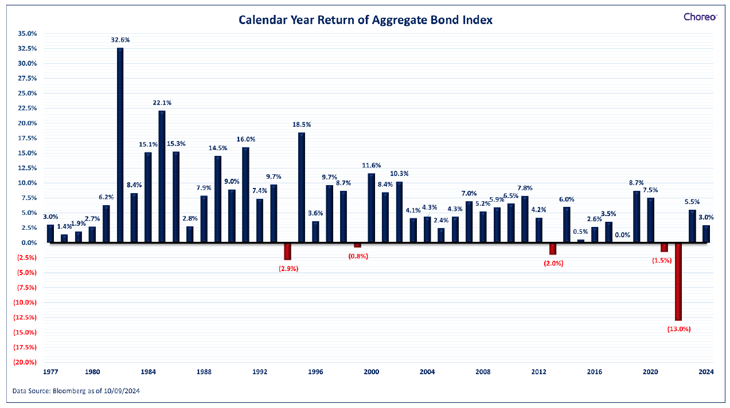 Investing involves a mix of thinking long term, not overly focusing on short term volatility (other than thinking opportunistically when short term volatility rears itself), and essentially “being a goldfish” as implied by the quote above from the popular TV series Ted Lasso. This is to say overly focusing on the recent past may be a hindrance to achieving long term goals. Examining a longer time frame shows that bonds have historically delivered positive total returns in all but a few relatively rare calendar years.