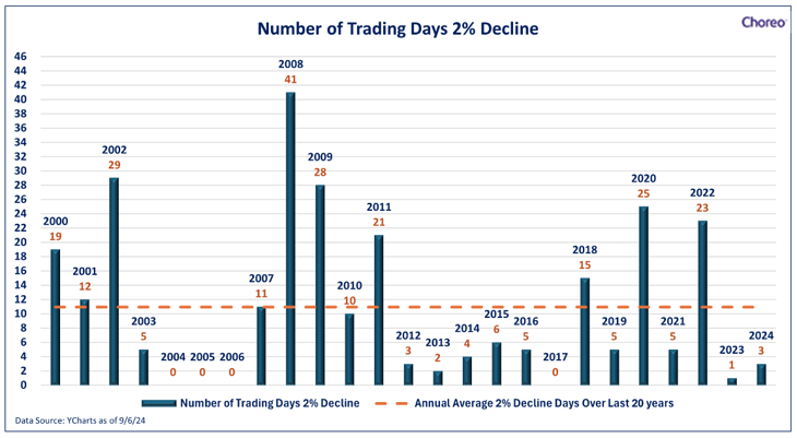 Market performance over time has been positive, but within this general trajectory, bouts of volatility have been the norm. Depending on how weekends and holidays fall, most years have around 252 trading days. Since 2000, markets (as demonstrated by the S&P 500) have averaged around 10 trading days per year where the index falls more than 2%. Thus far in 2024, markets have only experienced a 2% drop on three occasions (as of 9/6/2024). In other words, 2024 has been calmer than it may seem to many.