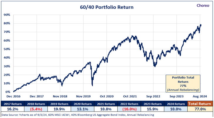 Another part of the market is also returning to a more typical state: Fixed Income. Bond yields were very low for many years, but due largely to inflationary pressures, rates have risen in recent years. This has made the math of bonds (potential price movement plus earned interest) more attractive, enabling them to once again serve the dual purpose of providing income as well as portfolio ballast. In other words, bonds often perform well when stocks do not. This has not been a consistent formula over time, particularly during the low interest-rate years seen recently. The fears of the balanced portfolio no longer being a valid investment approach are perhaps overblown as this year has shown a return to the norm. The graph below highlights a 60/40 portfolio performing well, particularly in recent months.