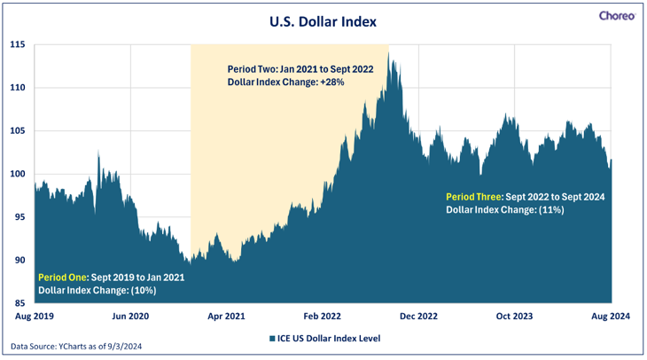 The U.S. dollar and currency strengths or weaknesses are often not discussed in the financial media. This year, the U.S. dollar has been weakening against a basket of global currencies as of late, likely in part due to the expectation of imminent Federal Reserve interest rate cuts. The dollar had experienced strength in recent years but this recent reversal with somewhat weaker performance against a basket of currencies may alter the global dynamics. The impact of currency movements around the world is profound for global trade and a normalization of currency movements could have meaningful effects if the trends persist. The graph below highlights various trends seen over the last several years.
